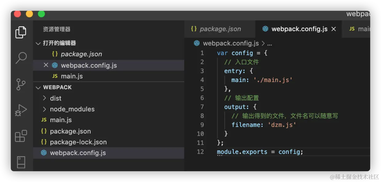 8、创建好 main.js 之后,我们需要配置一下 webpack.config.js