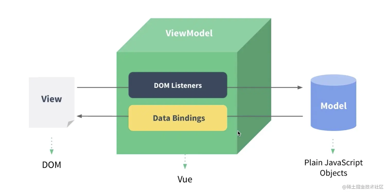 而Vue则采用的是mvvm这种模式,它在乎的是数据的变化驱动Ui的变化,不用用户管dom的操作,vue则扮演的是VM的操作,我们的重心是放在了M层也就是数据这一层
