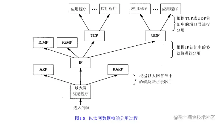 当目的主机收到一个以太网数据帧时,数据就开始从协议栈中由底向上升,同时去掉各层协议加上的报文首部。每层协议盒都要去检查报文首部中的协议标识,以确定接收数据的上层协议。这个过程称作分用(Demultiplexing)