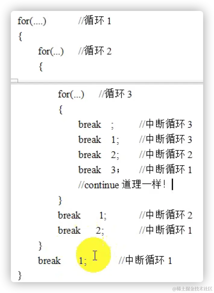 break 中断: 含义:停止(跳出)当前正在进行的循环(即完全终止循环),去执行该循环之后的语句。