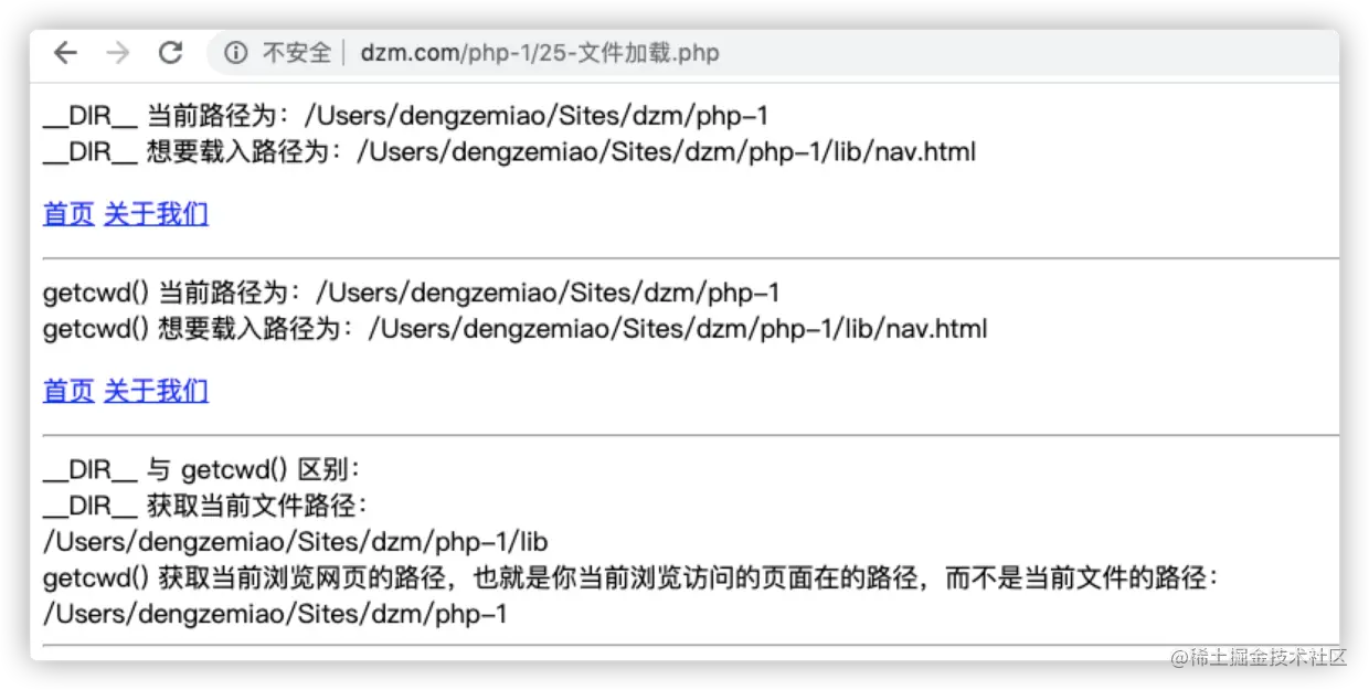- 获取物理路径(绝对路径)的方式: __DIR__:表示当前文件所在路径,由它可以构建出绝对路径; getcwd():表示当前正访问的网页路径,由它也可以构建出绝对路径;