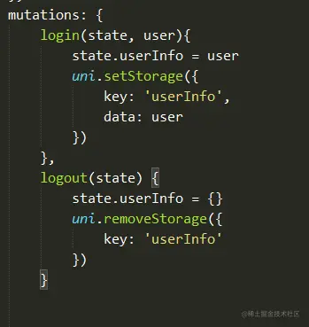 3、实现:uni-app 的官网的API 有这样一栏“数据缓存”,而且uni-app框架的主体是 VUE,那么我们就用 uni.setStorage 和 vuex 进行登录状态管理。