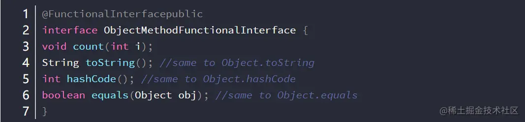 如果函数式接口中额外定义多个抽象方法,那么这些抽象方法签名必须和Object的public方法一样,接口最终有确定的类实现, 而类的最终父类是Object。 因此函数式接口可以定义Object的public方法。