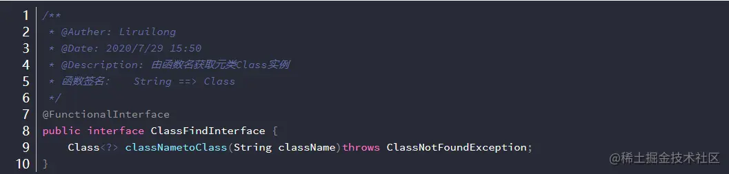嗯,我们来看具体的实现:很简单,我们要做的,即把Class<?> clazz = Class.forName("类名");当做一种行为去处理,接受一个String ,得到一个Class,所以我们要定义一个函数接口,描述这种行为。
