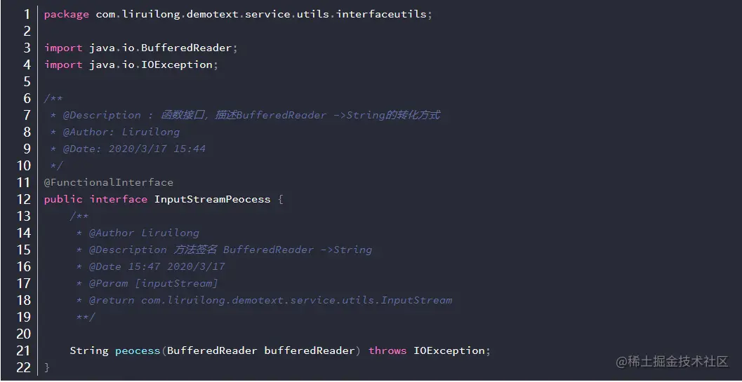 执一个行为,任何BufferReader -> String的Lambda表达式都可以作为参数传入。只要符合peocess方法的签名即可。