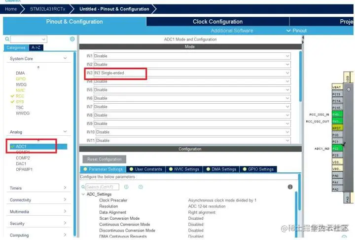 **知识补充:**ADC,模拟-数字转换器,可以将连续变化的模拟信号转化为离散的数字信号。其中,小熊派的ADC1的通道三已经被引出,即PC2