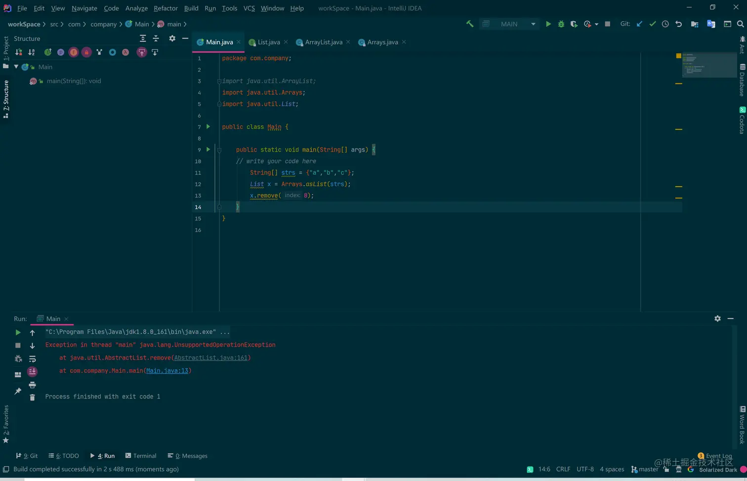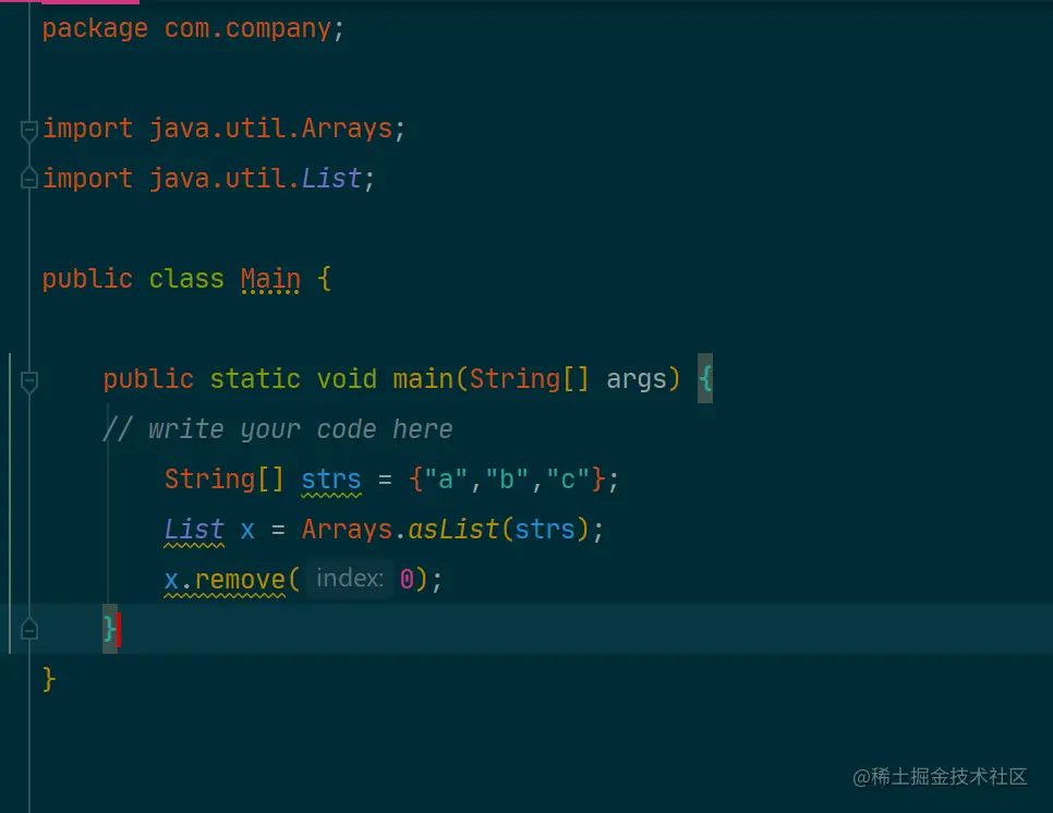 该问题作为一个经验丰富的程序员是肯定可以避免的,但是如果新手遇到此类问题,一定引起注意,切不可在Arrays.asList方法所返回的ArrayList对象中调用remove方法