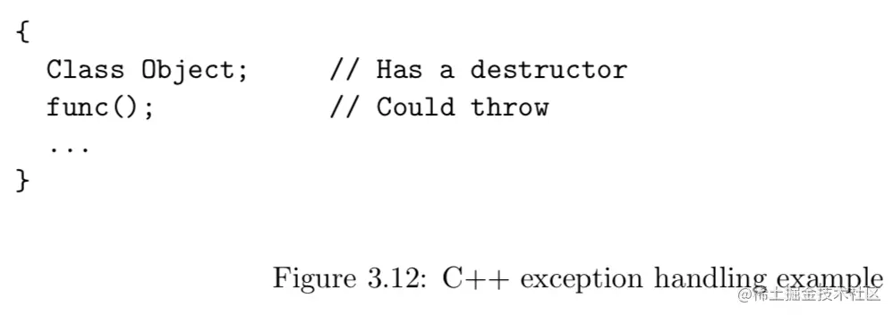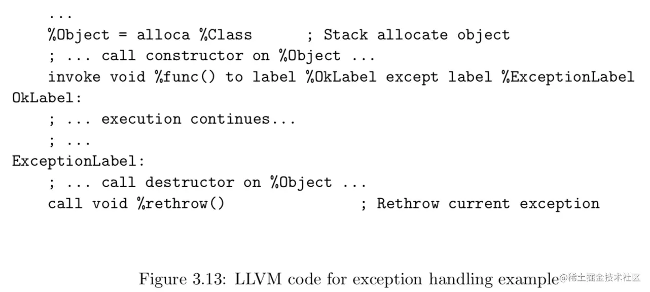 这里的一个非常简单的关键点是,当代码块退出时(指函数出栈),C++确保所有栈上分配的对象的析构器被调用。如果 func() 调用抛出了异常,代码块将会退出,必须设置一个具柄用来调用对象析构器。图 3.13 显示了图 3.12 的 LLVM 代码: