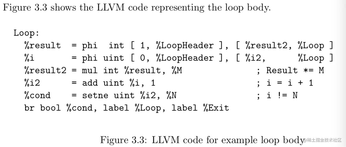 phi 是指令名称,φ函数;ty 类型名称,这里是 int 类型;后面的多个 [ , ] 表示特定分支来源 labeli 下,%result 会赋值为 vali 。比如在第一次进入Loop时,%result = 1,%i = 0,之后的所有迭代 %result = %result2,%i = %i2。