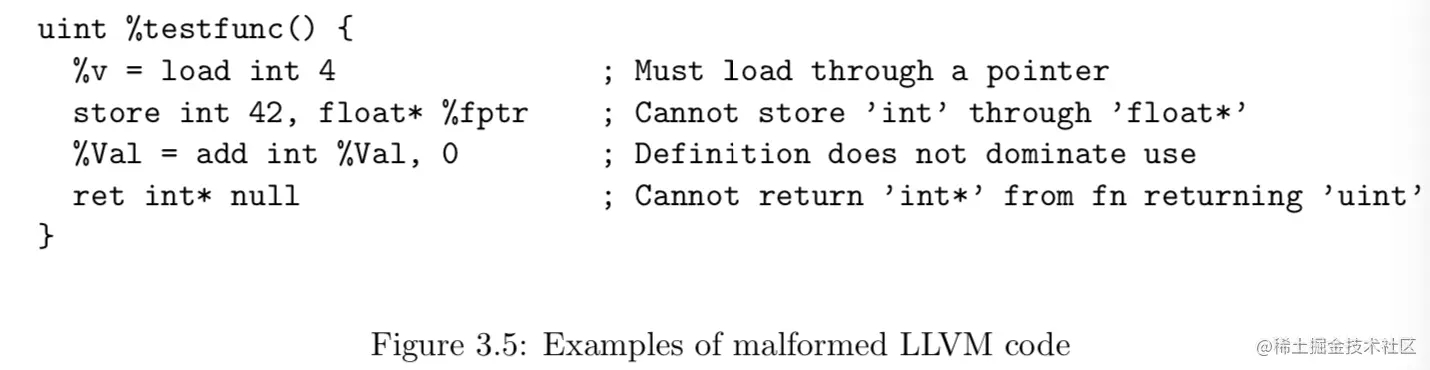 所有的 LLVM 指令都具有严格类型限制,限制其操作数以简化转换,并保持类型正确性。例如下图 3.5 中: add 指令,要求其两个操作数必须类型一致,integral 或 floating-point,并产生一个同类型的返回值;load 指令,需要你个指针操作数,作为加载源);store 指令,把某类型 τ 的值,存入 τ* 内存中。图 3.5 显示了一些错误的代码示范: