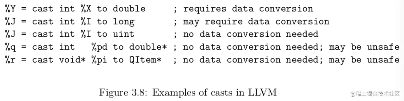 有两个进行类型转换的原因:显示转换一个值的类型,这时可能不需要操作类型;或把数据重新解读为另外一个类型。在 LLVM 必须使用 cast 指令进行类型转换,如: