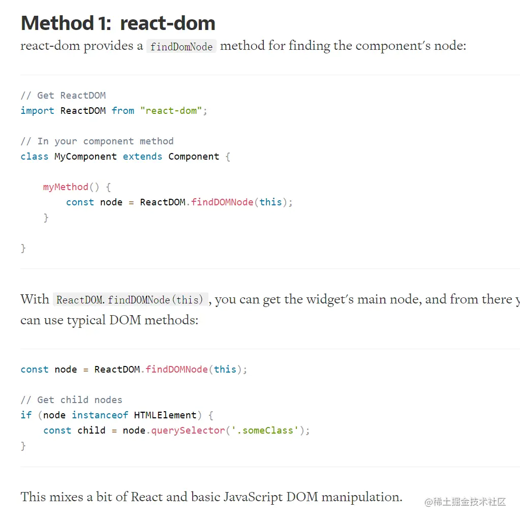 获取React的Node的两种方法 Frank同志68687 2020-09-28 746 阅读1分钟 在React里面怎么获取,类似 Document.getElementById('#id')这样的HtmlElment呢?