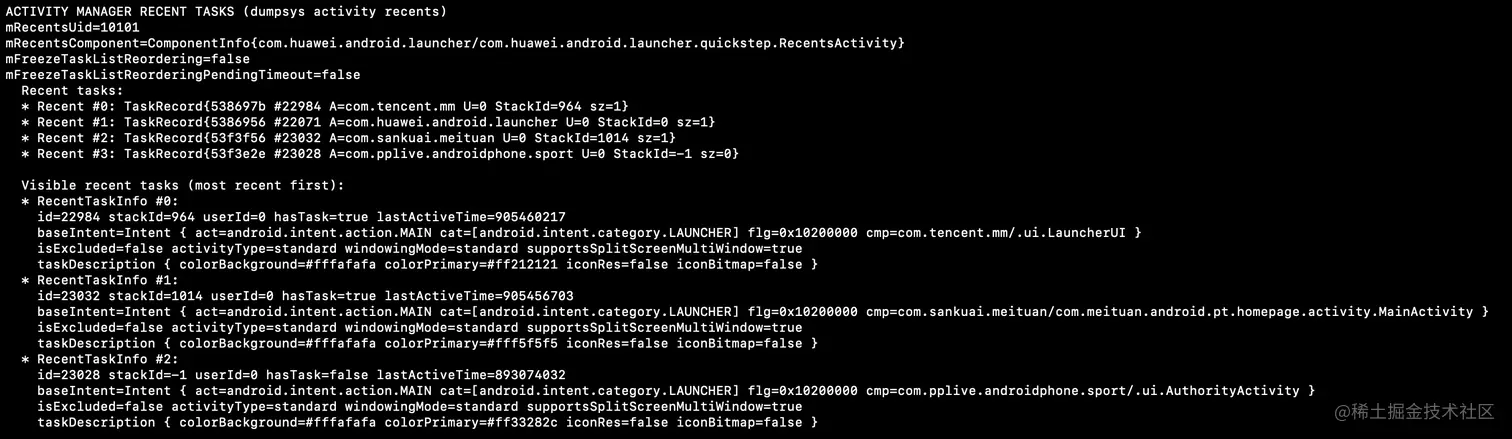 adb shell dumpsys activity,将得到一串非常长也是非常全的一串讯息。讯息是分段展示的,为了方便查找信息,可以全局搜索"dumpsys activity",然后分段查找。其中"dumpsys activity recents"这段,打印出了当前手机后台中运行的app任务栈。
