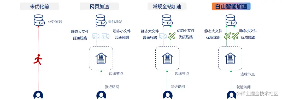 常规加速方式下,静态内容在回源过程中的时间消耗大大影响了用户体验。白山智能加速采用无差别优质加速策略,对于需要回源的静态、动态内容均采用优质线路回源,快速响应用户访问需求。