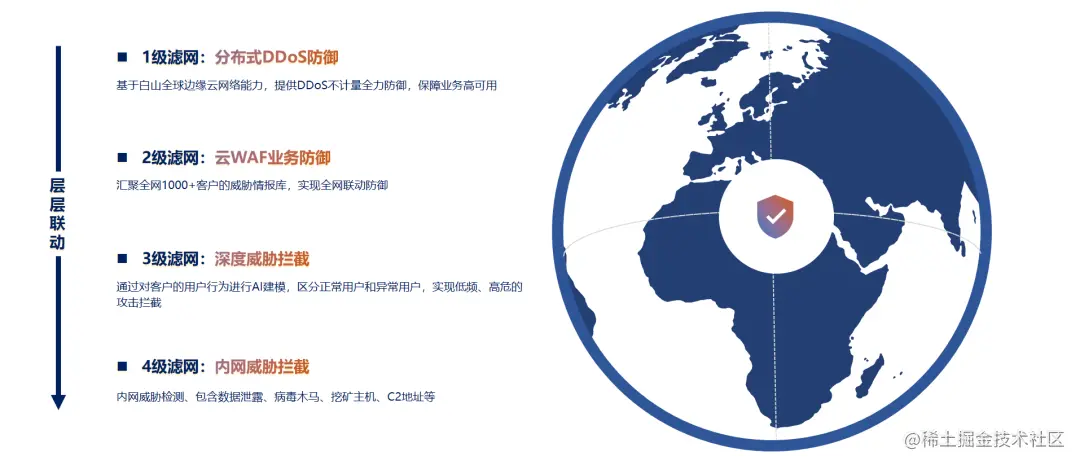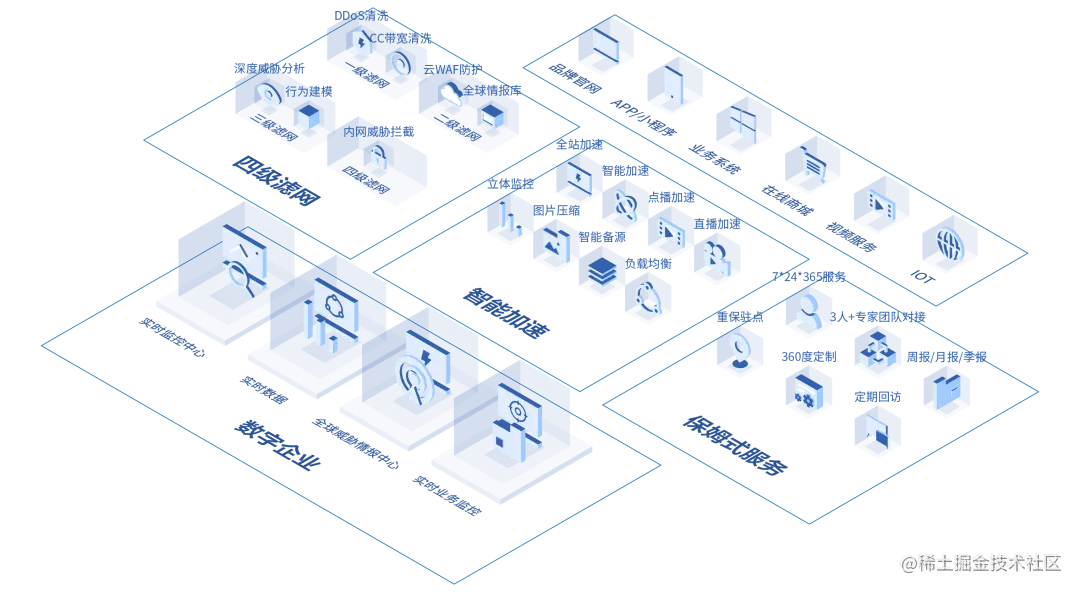 依托白山深度威胁识别ATD与YUNDUN安全产品,在多年攻防实战中的经验与技术积淀,“企业智慧安全加速”解决方案整合四层滤网安全能力,层层联动,一站式解决数字业务的安全诉求,为企业数据安全与业务平稳运行保驾护航。