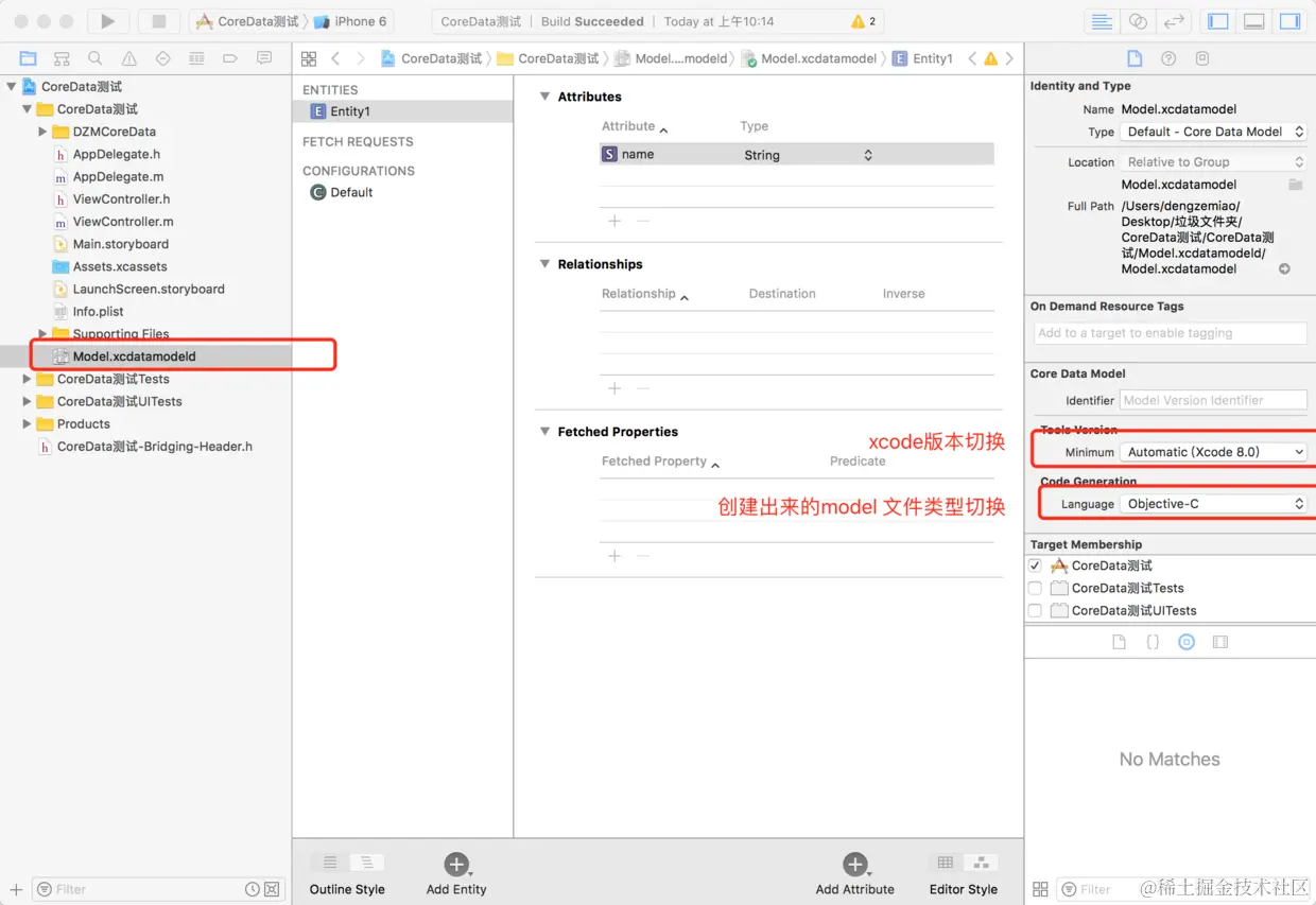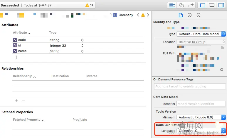 Tips:创建出的实体文件默认语言貌似是Swift的,想要OC版的小伙伴只需要选中你的 xcdatamodeld 文件,点击左侧选择对应语言再创建NSManageObject subclass即可!如下图