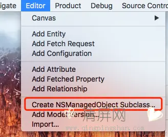 点击上方 Editor,选择 Create NSManagedObject Subclass 选项,如下图
