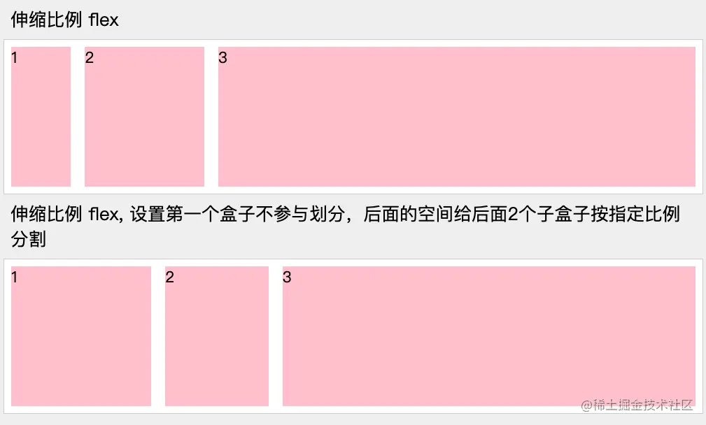 <h3>伸缩比例 flex, 设置第一个盒子不参与划分,后面的空间给后面2个子盒子按指定比例分割</h3>
