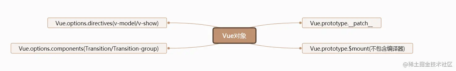 增加全局指令和内置全局组件,定义$mount(不包含编译器)和__patch__(diff算法函数):
