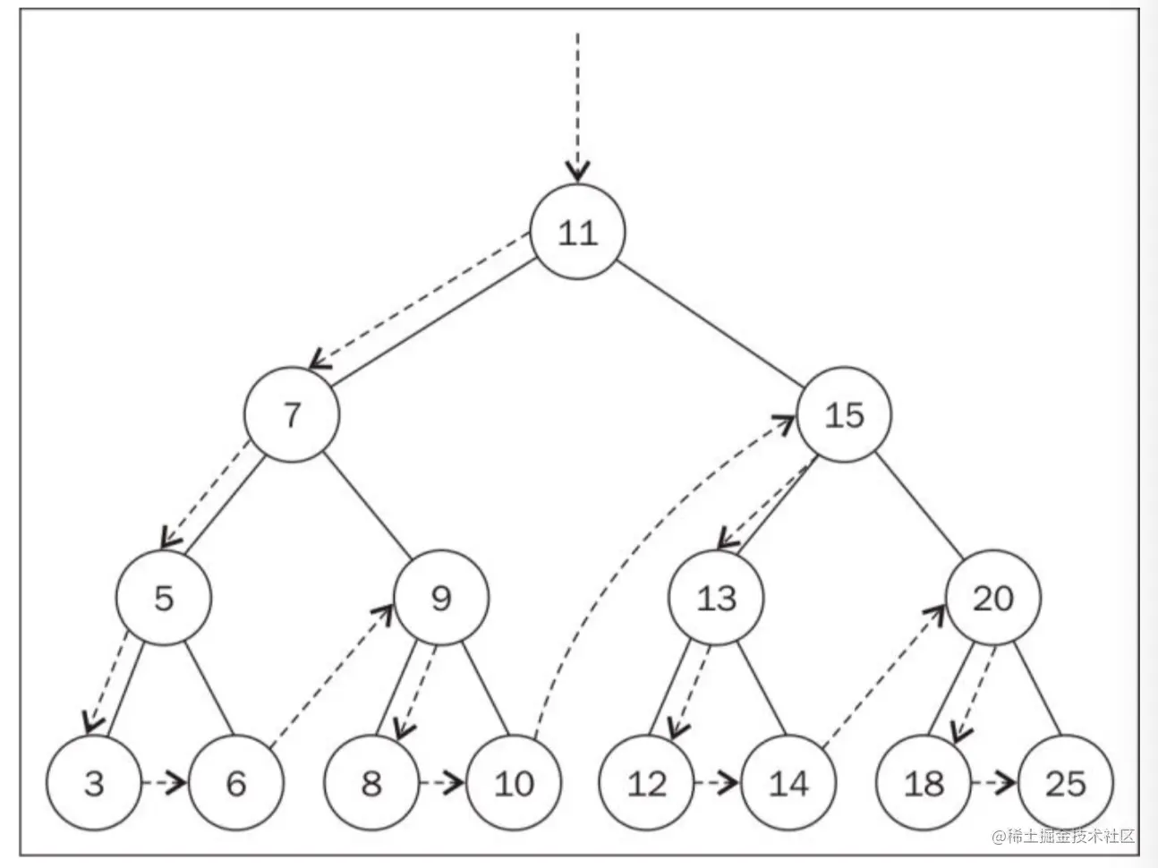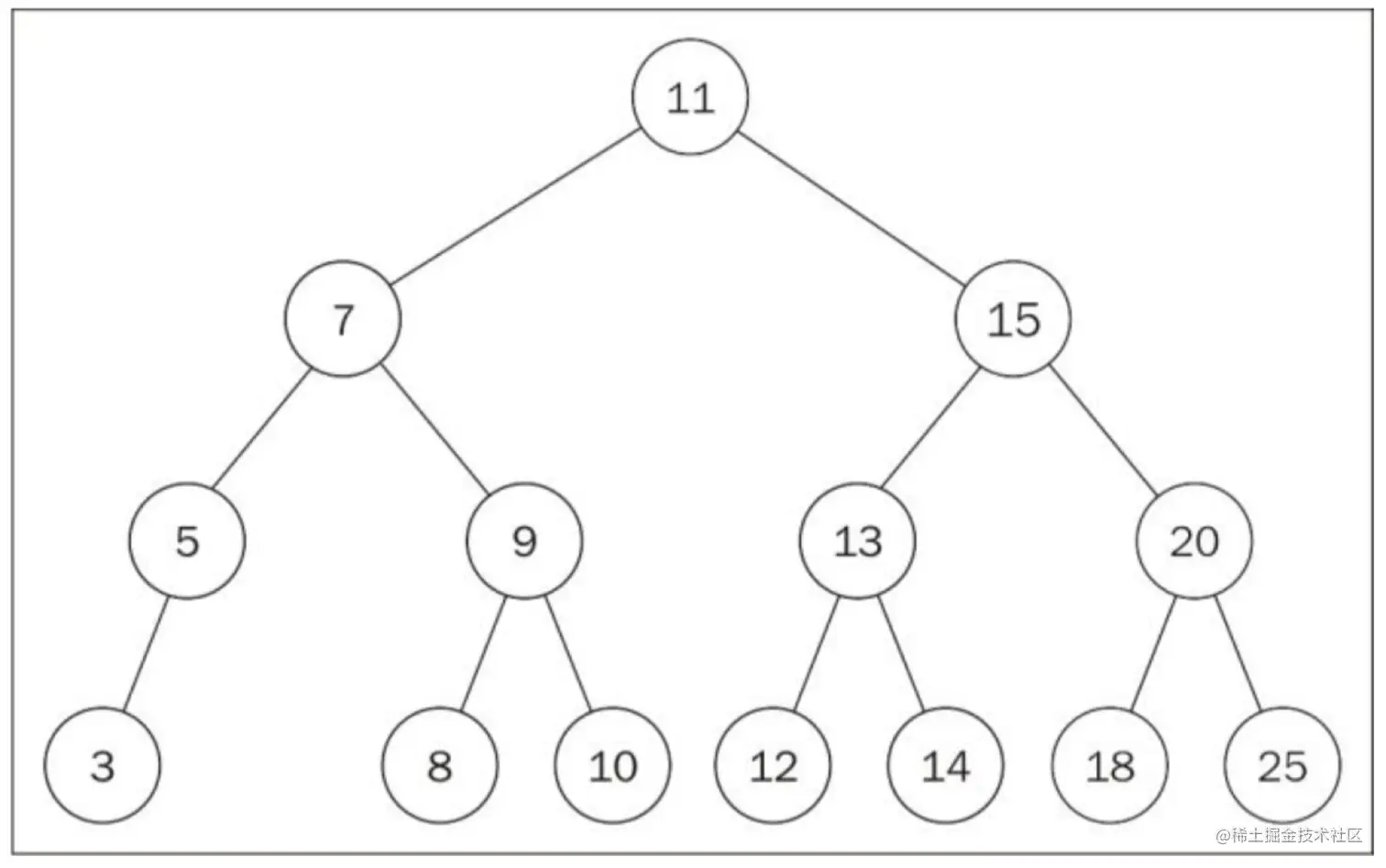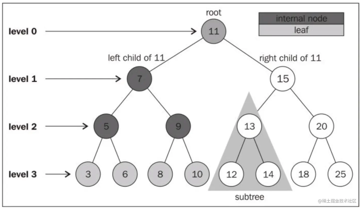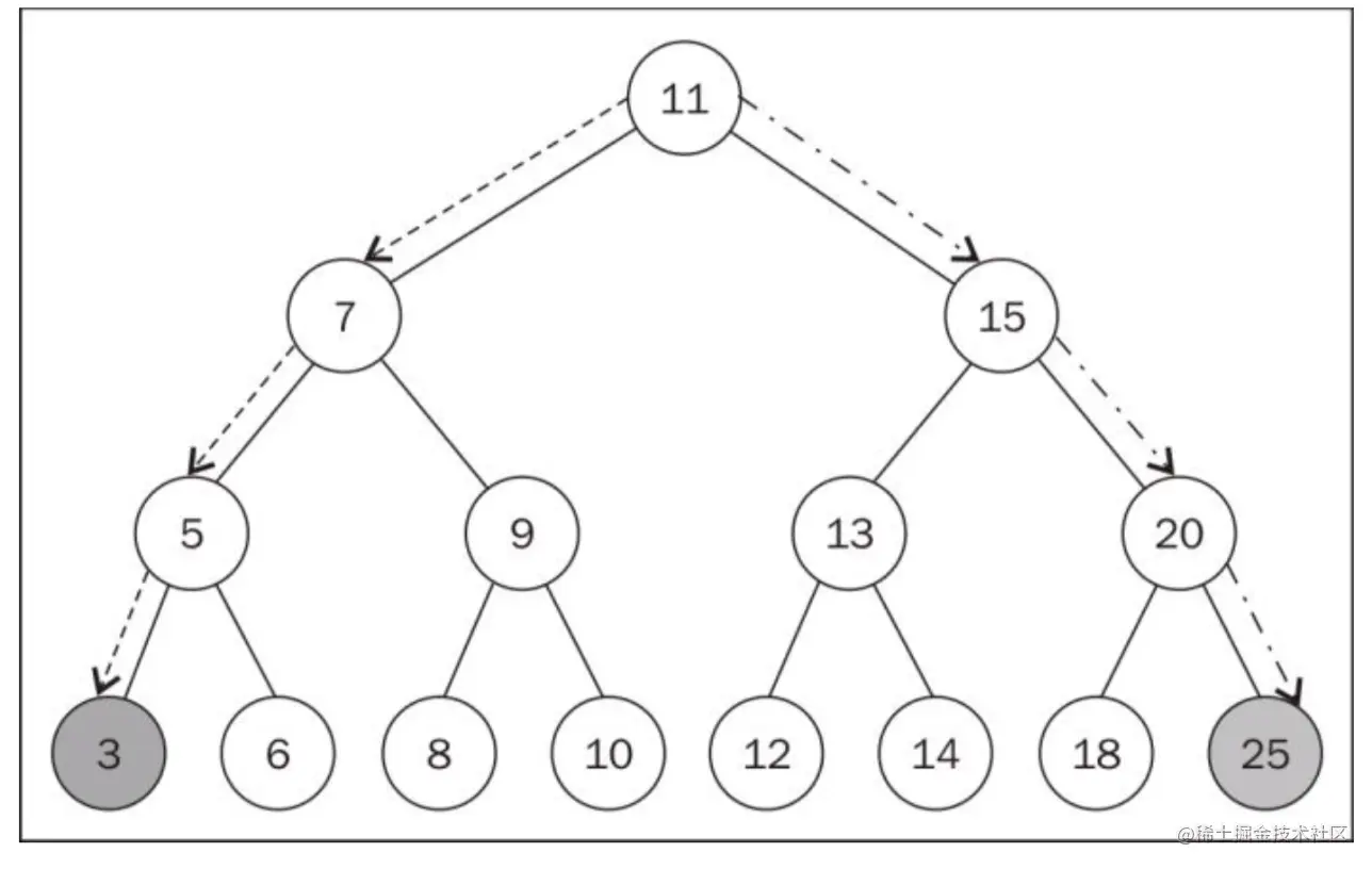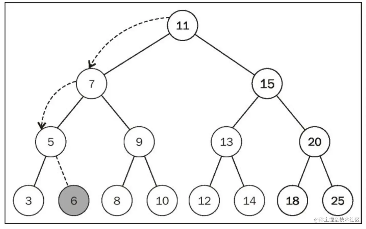 最顶端的节点(也就是刚刚的第一个节点),被称为根节点(11)。根节点是没有父节点的。树的成员都被称为节点。节点可以被称为内部节点和外部节点。至少有一个子节点的节点,被称为内部节点(7、5、9、15、13和20);而没有子节点的节点,被称为外部节点或者叶节点(3,6,8,10,12,14,18和25)。