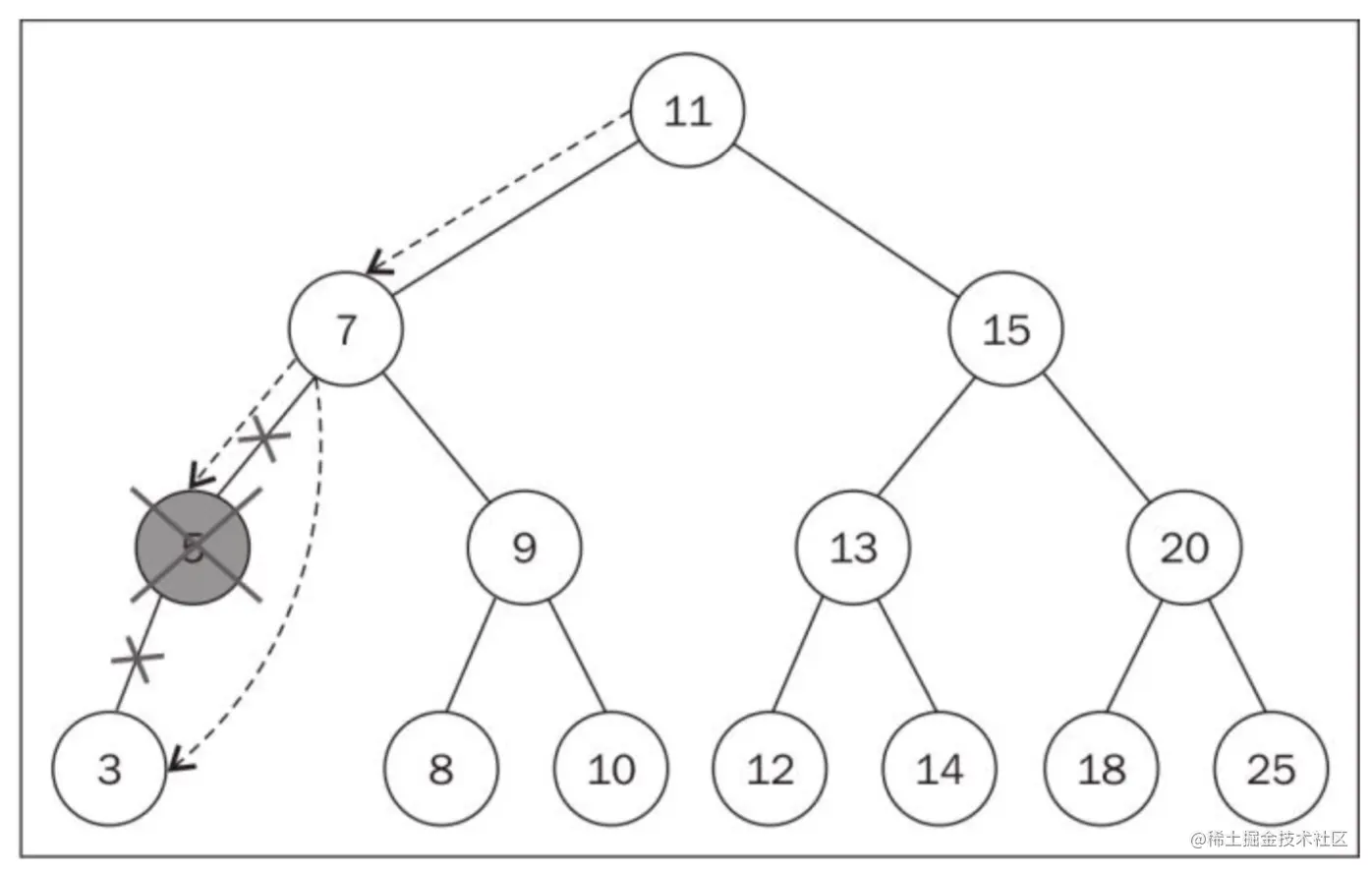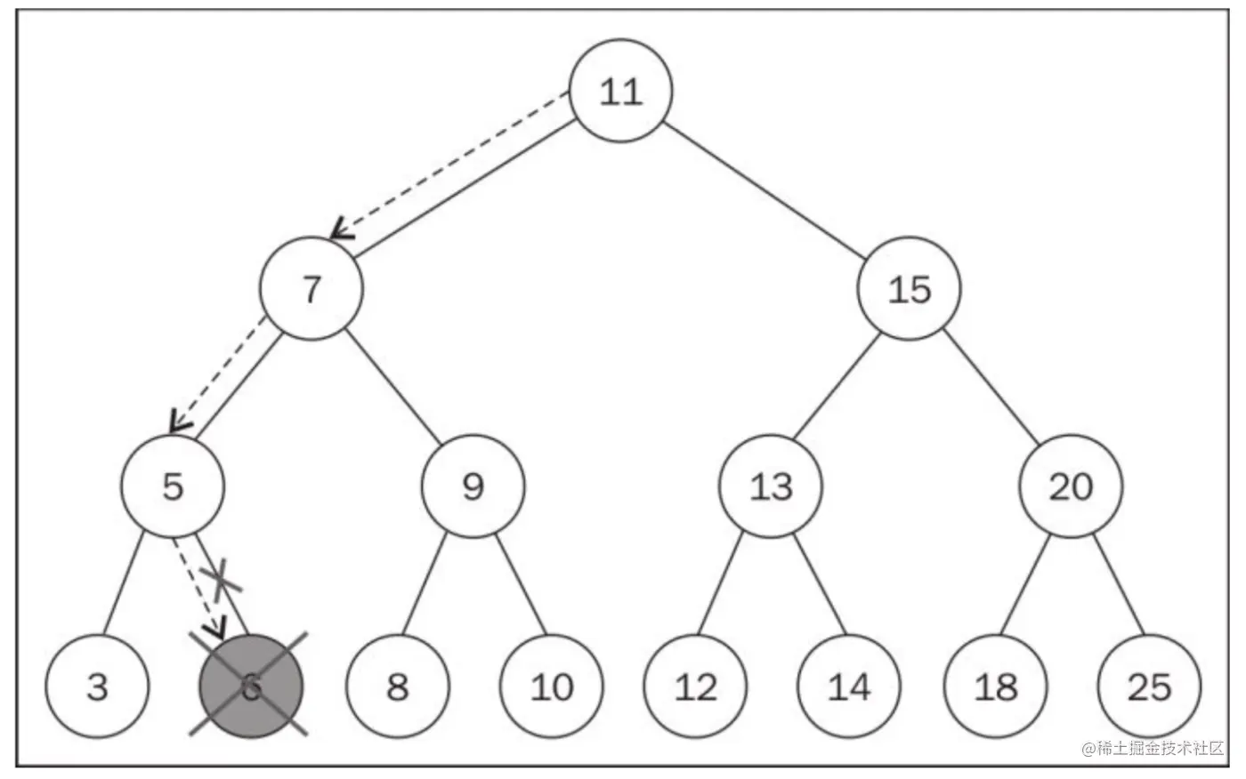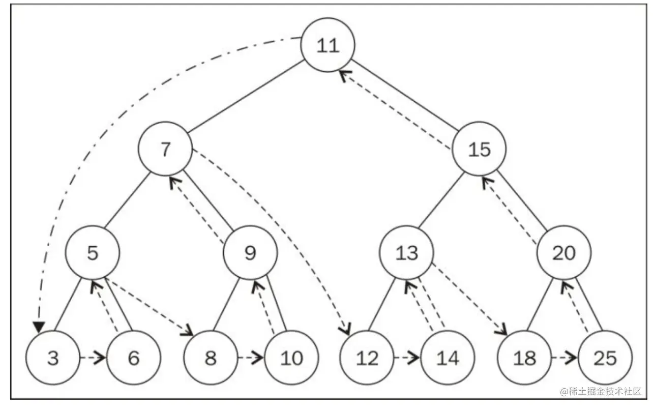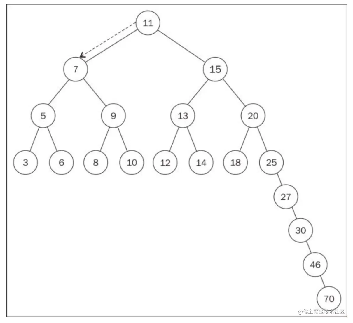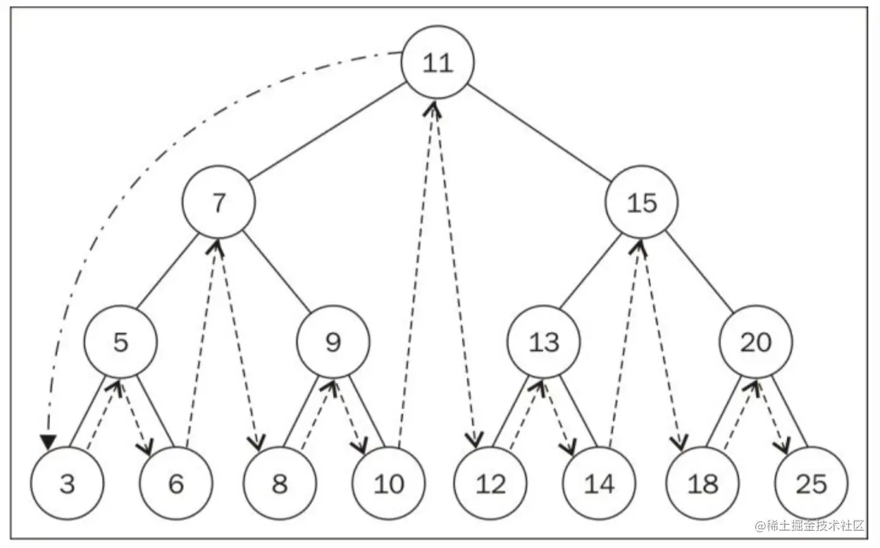 最顶端的节点(也就是刚刚的第一个节点),被称为根节点(11)。根节点是没有父节点的。树的成员都被称为节点。节点可以被称为内部节点和外部节点。至少有一个子节点的节点,被称为内部节点(7、5、9、15、13和20);而没有子节点的节点,被称为外部节点或者叶节点(3,6,8,10,12,14,18和25)。