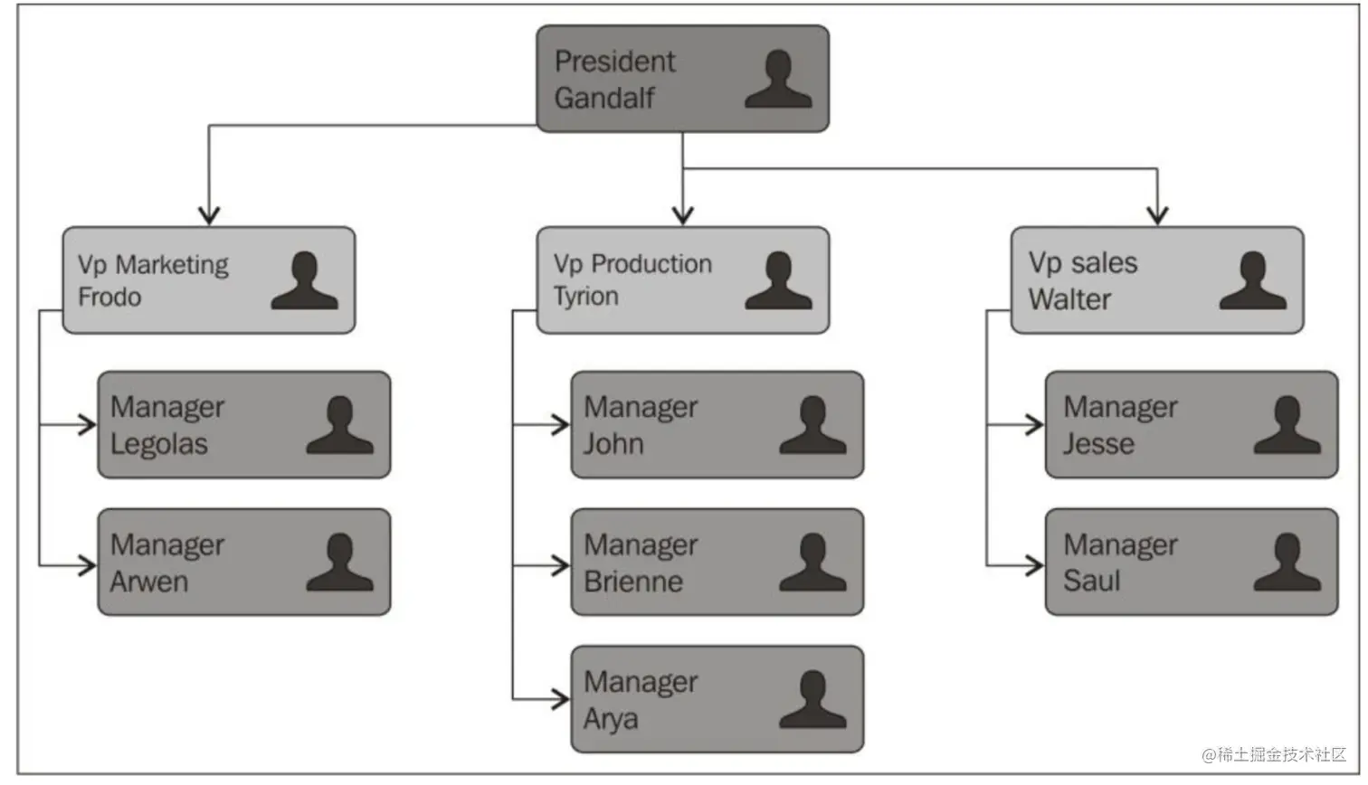 树结构是对人类社会中等级结构的抽象。树结构在生活中最常见的实例是家庭成员树、公司组织结构图: