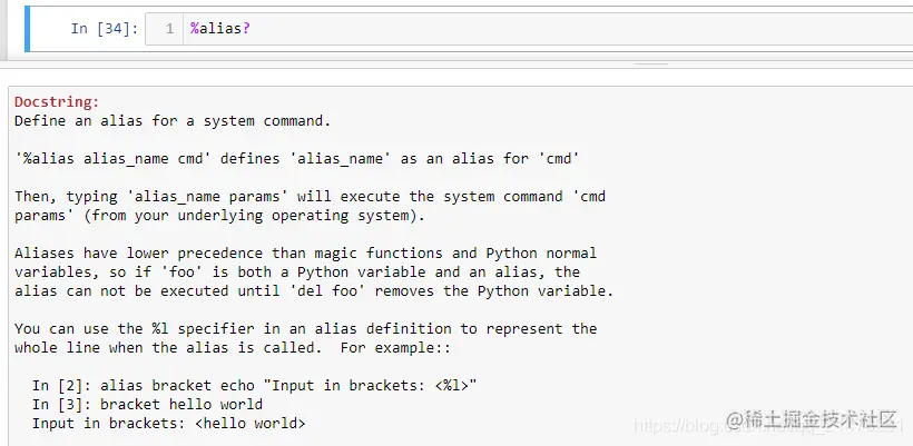 魔法命令名称?输出魔法命令的详细帮助文档,以%alias为例: