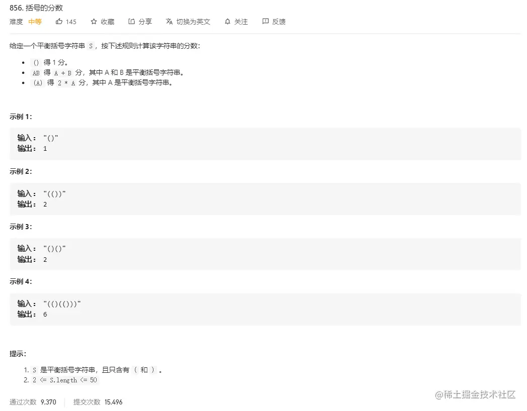 自己看这题的都有点迷糊,一直在想 A 和 B 是啥。原来** A 和 B 也是平衡括号字符串**。看了别人的思路,其实这题也不难。首先定义一个存放整数的栈,用 0 标记左括号,如果是遇到左括号,直接将 0 入栈即可。如果遇到右括号且当前栈顶为 0 (左括号),就把 0 (左括号)出栈,并且将分数 1 入栈。否则的话说明当前栈顶不是左括号,将之前的分数累加起来,直到遇到左括号为止。遇到左括号时,将左括号弹出,把累加起来的分数乘以 2 放入栈中。重复以上操作,直到平衡字符串遍历完毕。此时栈剩下的只有分数了,累加起来即可。