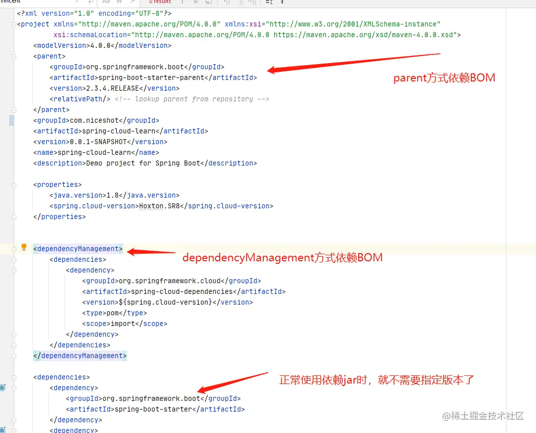 比如我有一个spring boot工程名叫spring-cloud-learn。由于其本身是一个spring boot工程,所以我可以直接引用Spring boot的BOM,通过<parent>配置,即可
