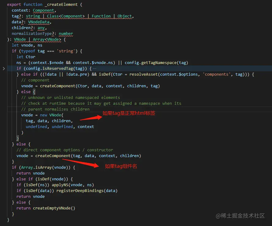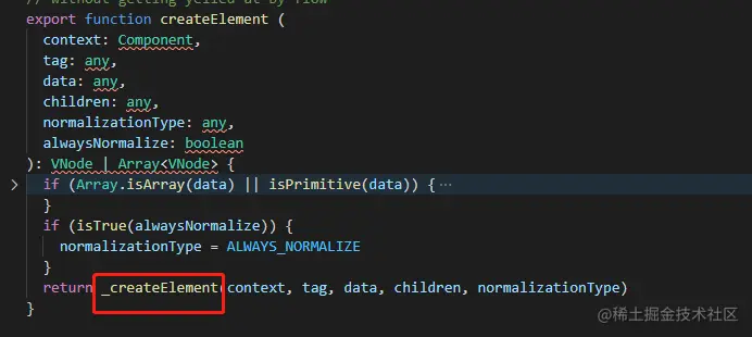 在实例初始化的时候,就会给实例绑定上_c方法,所以vm可以直接调用到_c,_c内部调用了createElement