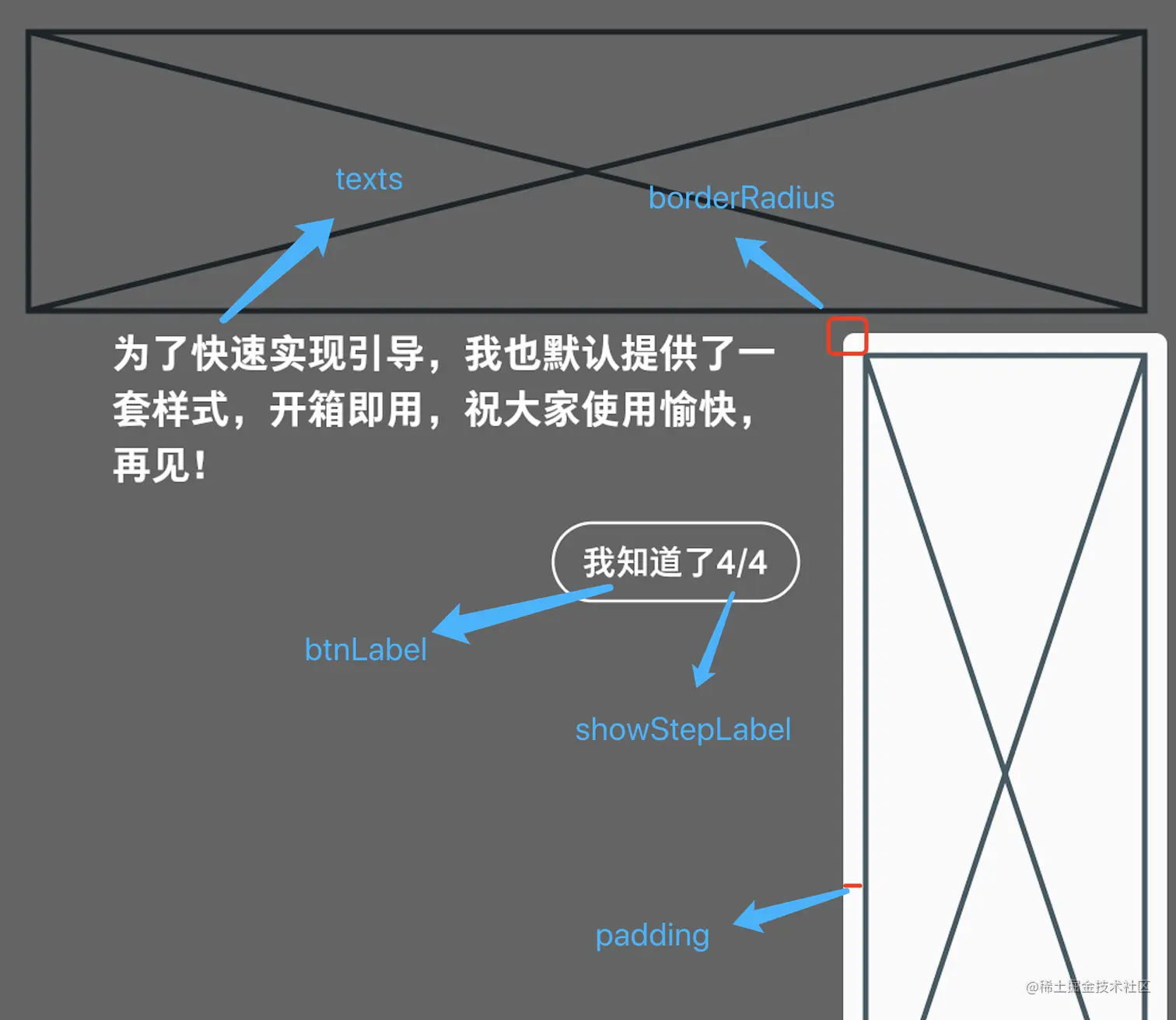 '为了快速实现引导,我也默认提供了一套样式,开箱即用,祝大家使用愉快,再见!',