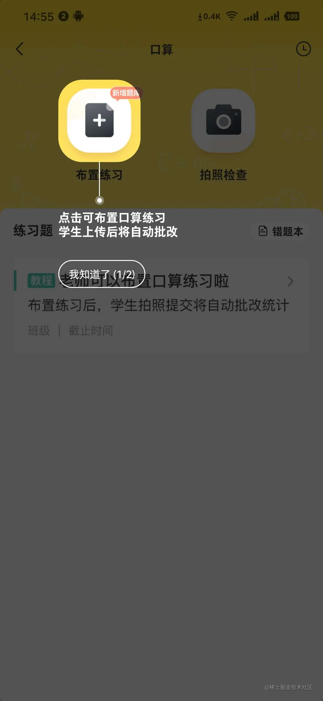 上图截图自我司 App 晓黑板中的口算模块,相信每个 App 开发在工作中都碰到这种场景,为了避免用户对新功能产生困惑,会对一些功能加一些引导操作。在原生开发中,例如 Android 开发中,我们可以使用 NewbieGuide 等开源库来实现。但是很遗憾的是,在 Dart packages 中找了一圈,一无所获。