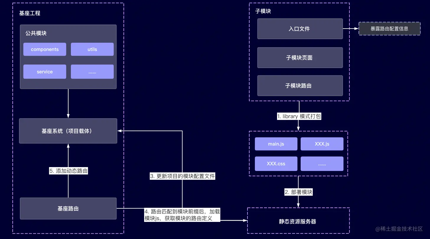 子模块这里和一些主流的微前端框架有一些出入,我们这里的子模块是一个单独的项目,但是又不算是一个完整的项目,他依赖于基座工程中的公用模块和方法定义,自身不需要也不支持单独部署,他的一个核心点就是对外暴露自身的路由配置,如果需要的话,在基座工程的 store 中,通过 registerModule 注册自己的 store。