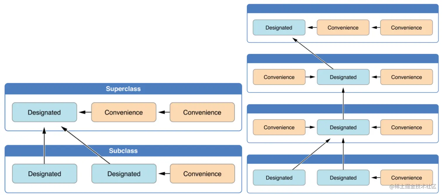 - 类偏向于少量指定初始化器,一个类通常只有一个指定初始化器