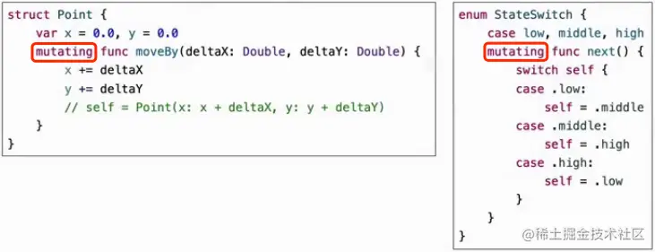 在func关键字前加mutating可以允许这种修改行为