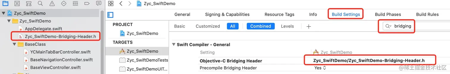 和Swift调用OC一样,在新建Swift类的时候会先提示创建桥接文件,也是用来OC需要暴露给Swift的,如引用OC头文件#import "ZycOCViewController.h"