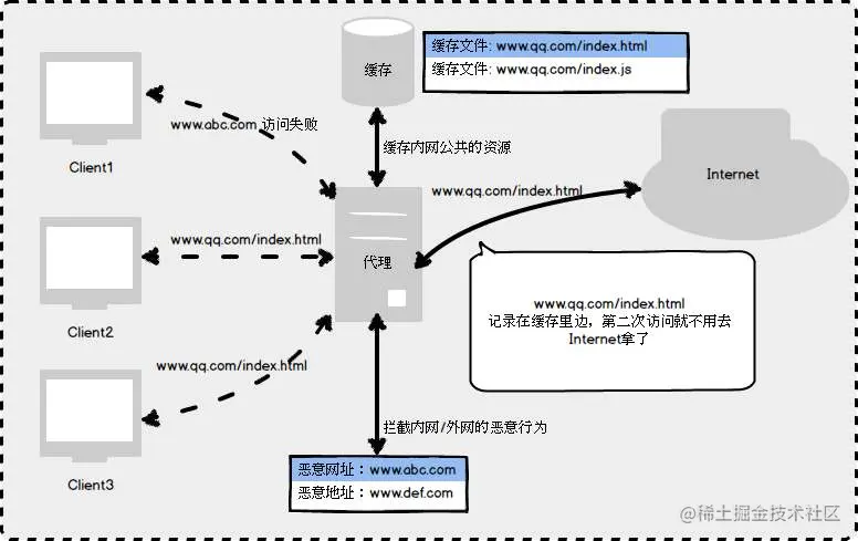 「正向代理(forward proxy)」:是一个位于客户端和目标服务器之间的服务器(代理服务器),为了从目标服务器取得内容,客户端向代理服务器发送一个请求并指定目标,然后代理服务器向目标服务器转交请求并将获得的内容返回给客户端。
