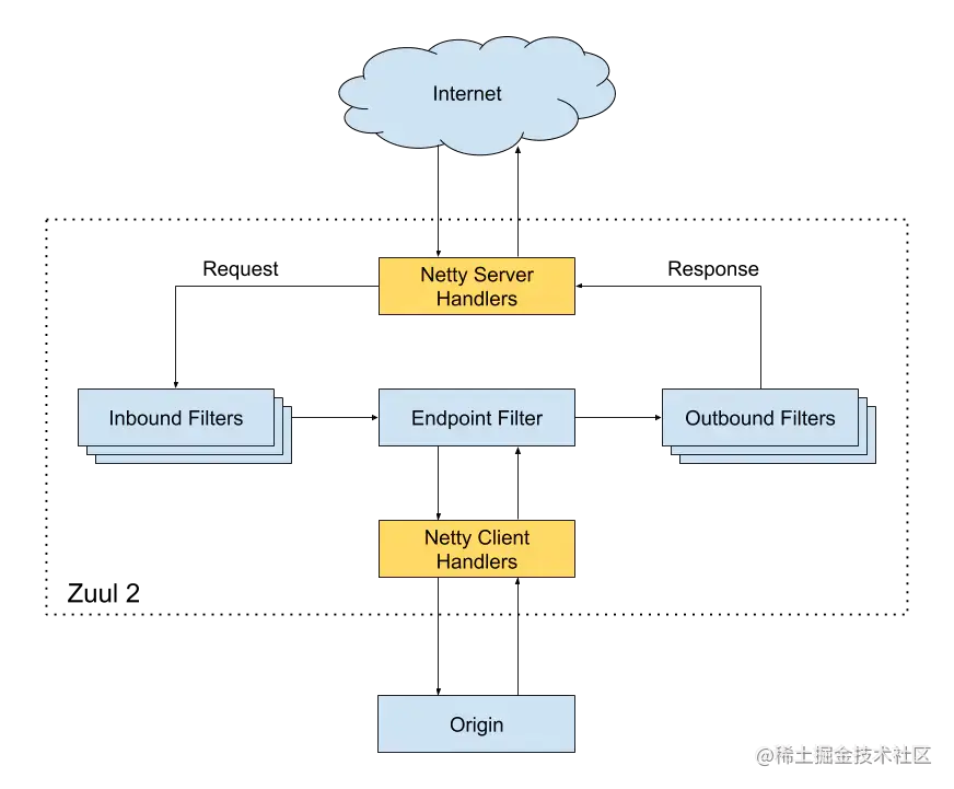 zuul2.0: 使用netty server作为网关监听服务器监听客户端发来的请求,然后把请求转发到前置过滤器(inbound filters)进行处理,处理完毕后在把请求使用netty client代理到具体的后端服务器进行处理,处理完毕后在把结果交给后者过滤器(outbound filters)进行处理,然后把处理结果通过nettyServer写回客户端。