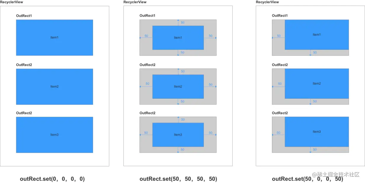 RecyclerView.ItemDecoration 允许应用给具体的 View 添加具体的图画或者 layout的偏移,对于绘制 View 直接的分割线,视觉分组边界等等非常有用。