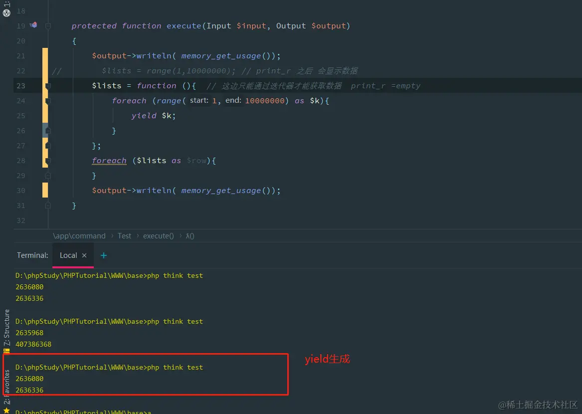 关于php 数组数据较多占用更多内存优化方法 掘金小天才 2020-09-29 172 阅读1分钟 普通数组 使用yield生成器 注意:使用yield生成的数据后,需要通过迭代 foreach 的方式才能获取到数据,不然的话.....