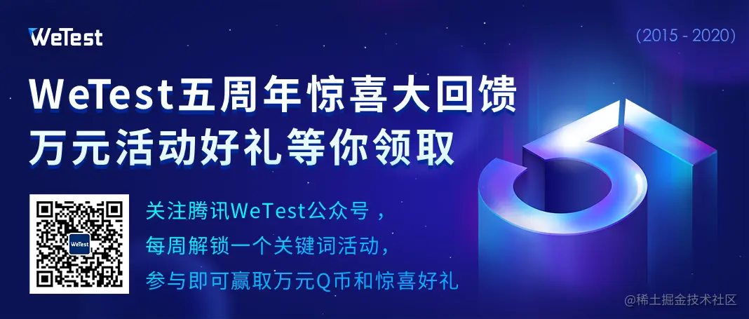 为了回馈过去这五年用户们对WeTest的支持与信任,在WeTest五周年当周(10.26-11.2),我们为平台新老用户准备了全方位的丰富福利。在10.26日之前,我们会不定时地在WeTest公众号内曝光五周年庆福利内容,并且每期推送都将会有公众号特别活动推出,参与活动可以赢取千元礼品和万元Q币奖励。
