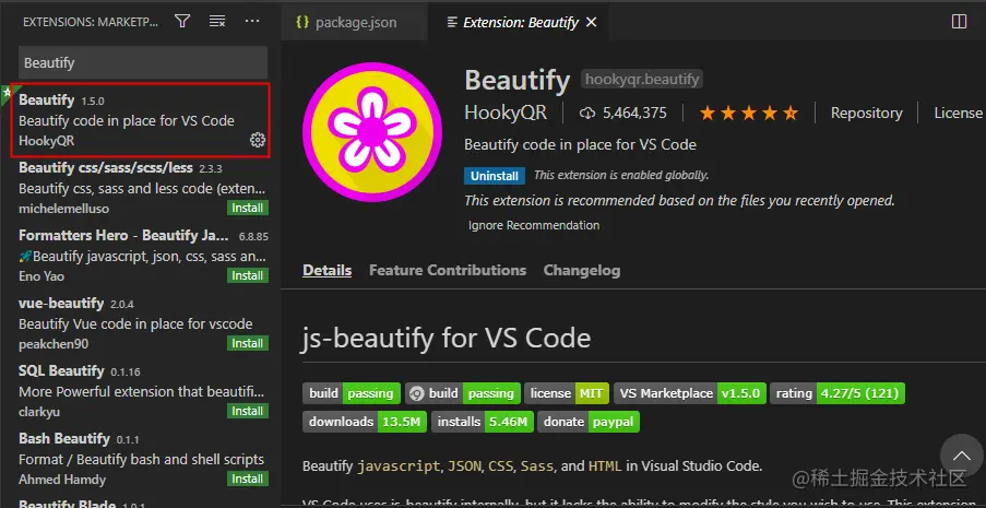 3.验证是否修改成功,打开vscode,尝试着安装一个扩展插件Beautify,如图: