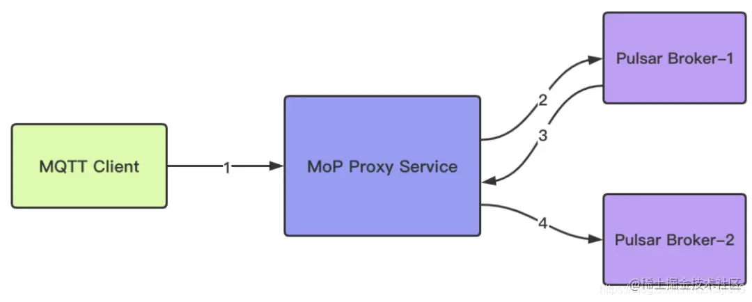 - MoP Proxy 建立与 Topic 所在的 owner broker 的连接,并开始在 MQTT 客户端和 Topic 所在的 owner broker 之间传输数据。