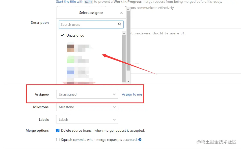 Source branch选择feature/new-feature分支 > 1. 右边的Target branch选择主仓库的develop分支 (👋记住是主仓库)> 1. 之后点击assignee选择你的名字