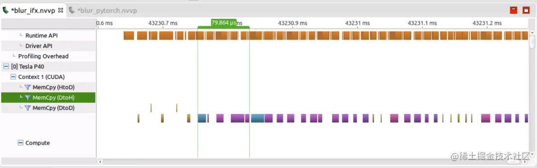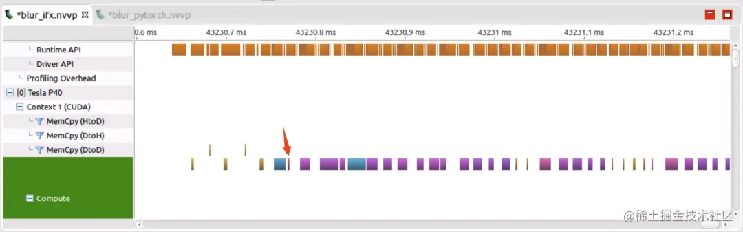 可以看到完成17个算子的计算,GPU 上的耗时大概1.39ms,而其中真正计算占比很小(大约104us),空白区域是 PyTorch 调用到 GPU 其他的一些 Runtime API,这样看GPU 计算资源没有被充分利用。所以说针对 PyTorch 框架:operations more,waste more.