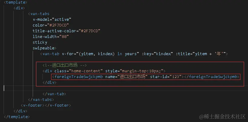 vue复选折线趋势图(2)引用组件静态 黄hxf 2020-09-29 168 阅读1分钟 1,引入复选折线组件 import foreignTradeSwjckpmb from "@/view/customs/modules/foreign-trade-swjckpmb_data"; 2.把组件放入tab页面中 <foreignTradeSwjckpmb name="进口出口市场" star-id="123"></foreignTradeSwjckpmb> 传入组件的一些相关参数,比如标题,和组件id(便于以后搜索功能) 别忘了注册组件