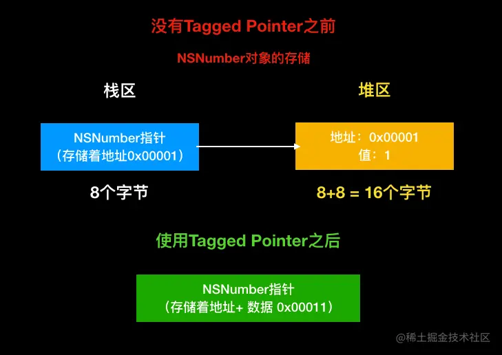 Tagged Pointer技术之前、NSNumber等对象的存储需要动态分配内存、维护引用计数等,NSNumber的指针存储的是堆中NSNumber对象的地址值。