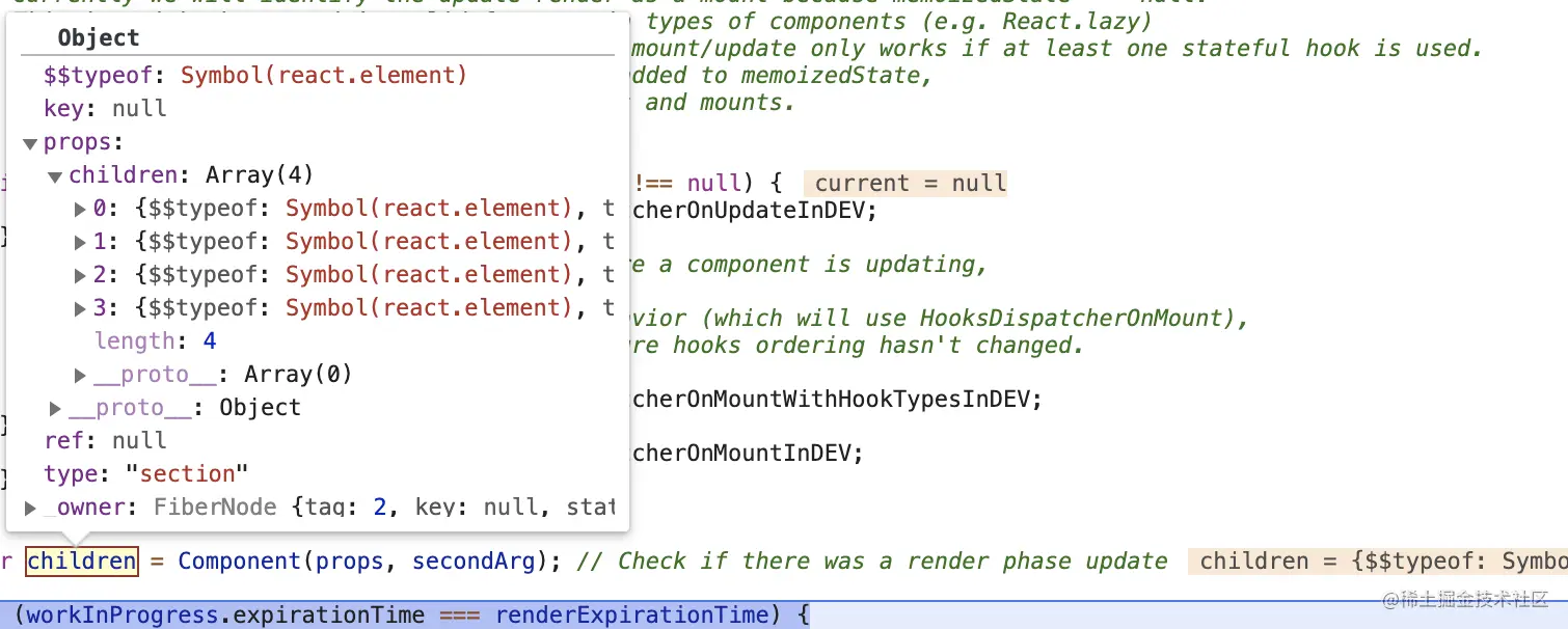 并且会返回nextChild,比如这里就是section; 最终会进入render child的阶段