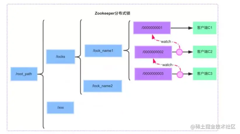 首先创建持久化节点/lock_name1,每当有客户端来访问/lock_name1节点,就在该节点下创建一个临时有序子节点,由于临时有序节点是递增的,所以总有一个临时有序节点的序号是最小的,那么这个序号最小的节点就可以获得分布式锁。而其他未获取到锁请求则通过Watcher机制监听上一个比自己序号小的节点。
