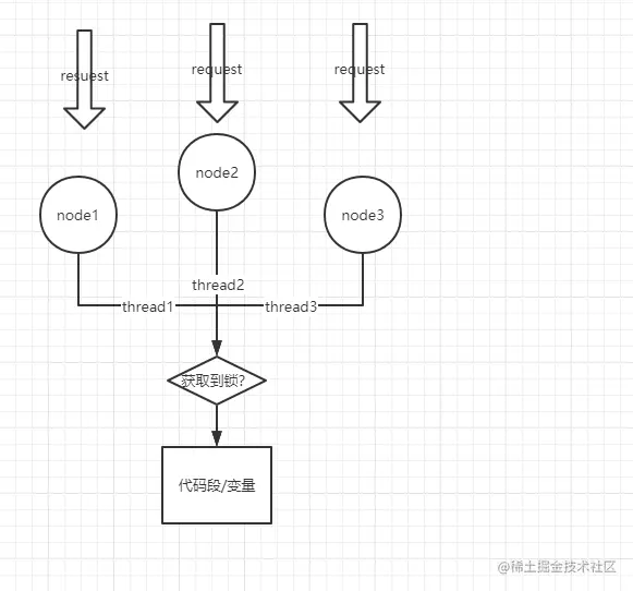每个节点都会由本结点的JVM启动一条线程去处理这个请求,假设三个线程thread1,thread2,thread3正好在同一时刻到达统一代码段,但是该段代码同一时刻只能有一个线程执行,这个时候就需要让这三个线程去竞争这个锁,只有获取到锁的线程才可以去执行这段代码,其他两个线程需要去阻塞等待或者直接返回。